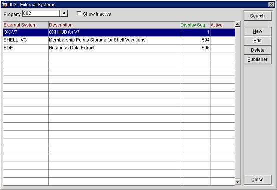 The External Systems screen allows a user to setup and activate external systems for properties that communicate outside of Opera. To access this screen, select System>Configuration>Setup>Business Events>External Systems. The External Systems screen appears.
