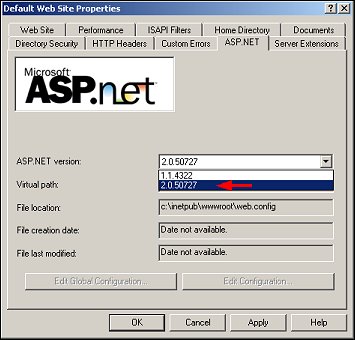 5. In the ASP.NET version field, select the down arrow and select the 2.0 version, as shown below.