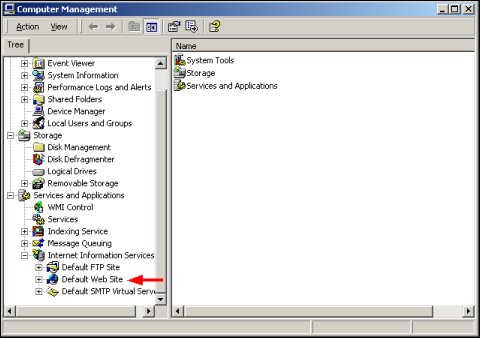 2. The Computer Management Window appears. Select the + to expand Services and Applications, click the + to expand Internet Information Services, and then click the + to expand Default Web Site.