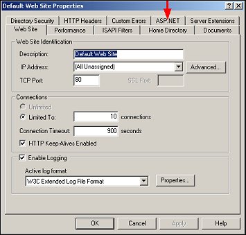 4. From the Default Web Site Properties screen, select the ASP.NET tab.