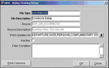 The Doorbook Export allows the user to select from among a specific set of reservation-related data (pulled from the EXP_GR_DOORBOOK view) and print an online report showing any changes to the selected data fields.