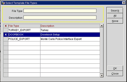 To set up the Doorbook layout, select Miscellaneous>File Export>Country or Configuration>Exports, Country Exports. The Export File List screen appears. Select the New button and from the list of templates select DOORBOOK.