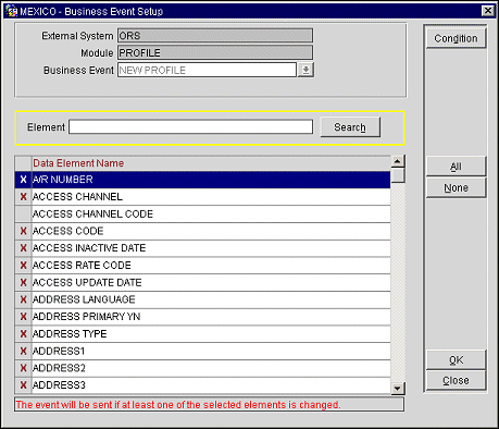Selection of the Data Element Name is done by selecting in the X column to the left of the data element. When a Data Element Name is selected here and an action is carried out in OPERA that involves that data element, a business event is generated. Which then becomes a message to the external system.