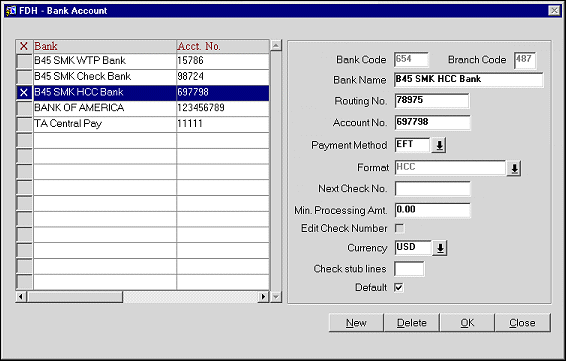 Bank Accounts – at least one account with each payment method EFT (CENT if no EFT license was purchased) and CHK has to be configured for Travel Agent profile commission processing. |