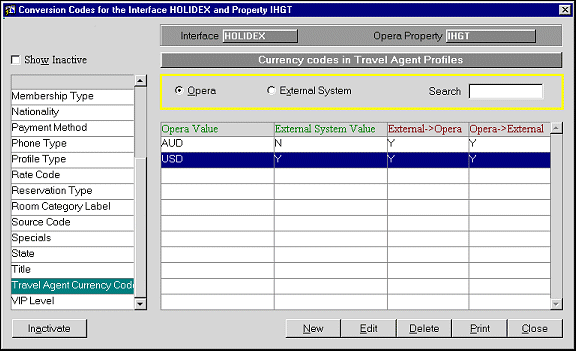 Example: In the example below we have linked the currency code USD to the external system value Y, which indicates the central commission payment for this interface. Holidex will always send Y and N. If you are using another interface, please verify what values the external system will send, and configure the OXI TA currency code conversion table accordingly.