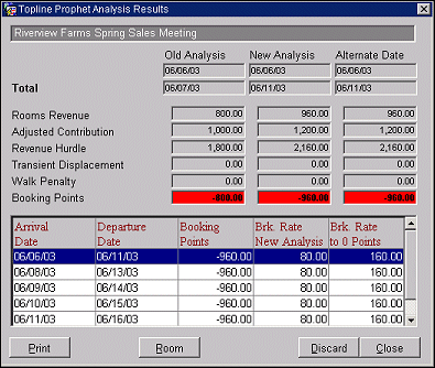 Room/Total. These buttons toggle the display to show analysis results Per Room Night or for the Total stay.