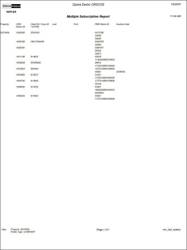The report displays the property(s) selected and the ORS Name Id, PMS Name Id, Client Id/IATA#, Corp Id, name of the person, and if the subscription is currently active or inactive.