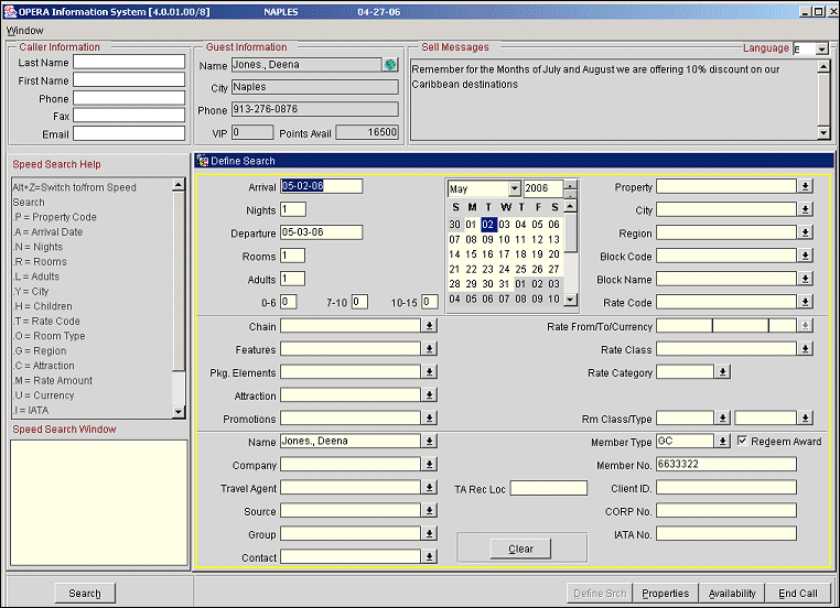 Once the guest profile and the membership number is selected, the available points appear in the Guest Information section for that membership.