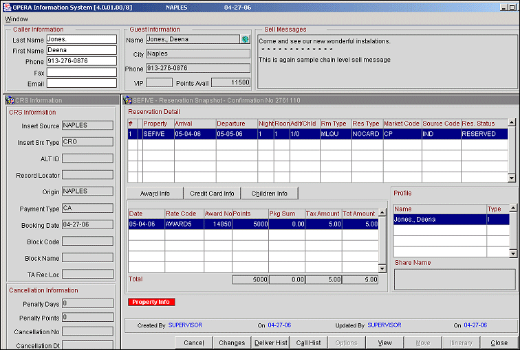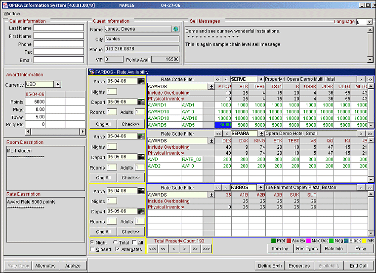 Awards based on rate codes can be redeemed during a reservation from the ORS Sales Screen. The advantage of redeeming awards from the Sales Screen is that only one Opera session needs to be open (as opposed to two sessions: one for the profile and one for the reservation). The system displays the guest's available points and also automatically deducts points when a reservation is made. The available award points, award points deducted, and other points information is displayed throughout the reservation screens, including the Closing Script and Confirmation Letter.