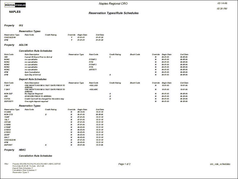 When Cancellation Rules or Deposit Rules are selected as filters, the Rule Code appears along with the Rule Description, Reservation Type, Rate Code, Credit Rating, Block Code, Override Y/N, and begin and end dates.