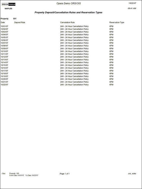 This report displays deposit rules, cancellation rules, and reservation types for one or more selected properties in the CRO database. Users select the date range for which to include the information.