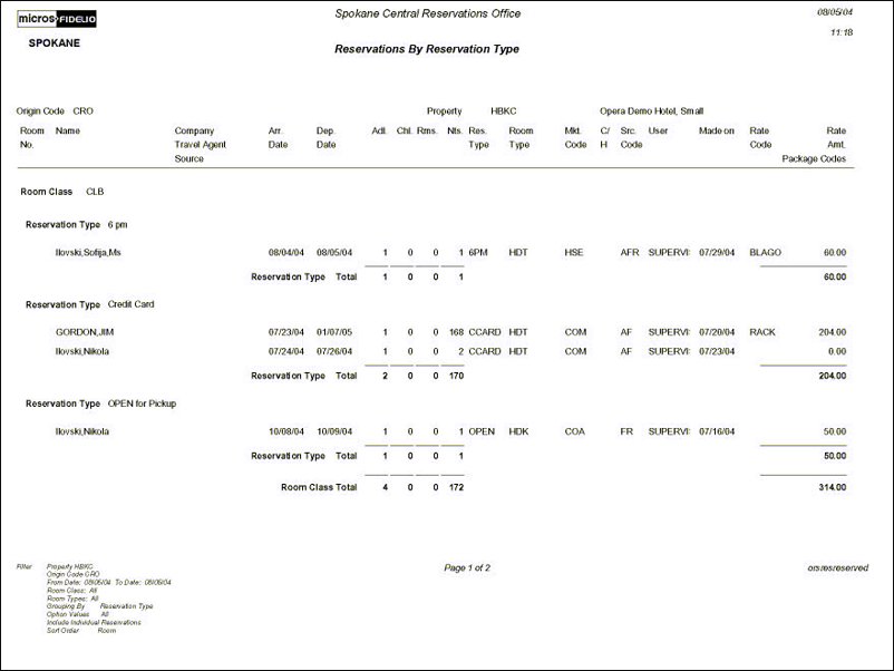 This report displays reservation information grouped by reservation type. Other information includes: Arrival/Departure Dates, Rate Code, Rate Amount, Nights, Room Type, Market Code, Source Code, and Company.