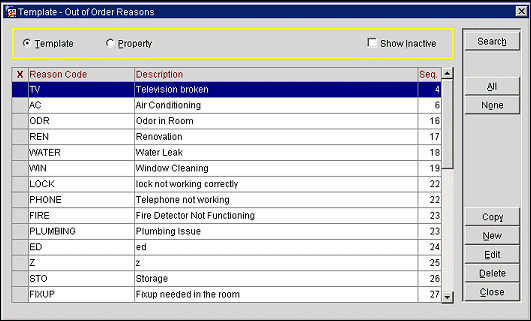 Template/Property. When the OPP_MHOT Multi-property add-on license code is active, out of order and out of service reason codes may be set up as templates that can then be copied to multiple properties. To set up templates, select the Template radio button. To configure and edit reasons for specific properties, select the Property radio button and choose the property to configure reason codes.