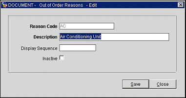 The Out of Order Reasons - New or Out of Order Reasons - Edit screen displays the following information.