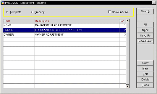 All. Only available when the Template radio button is selected. Select to choose all of the adjustment reasons to copy to property.
