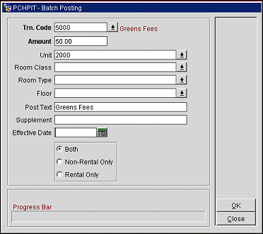 OK. Select the OK button to make the batch posting to the owner account or accounts. The Progress Bar at the bottom of the form will display the progress of the Batch Posting along with the percentage complete.