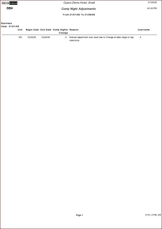 The Comp Night Adjustments report displays comp night adjustment information for a specified date range. This information includes the date range, unit number, business date of the adjustment, the begin and end dates of the contract, the comp nights change, the reason for the change, and the Opera user name of the person who made the change.