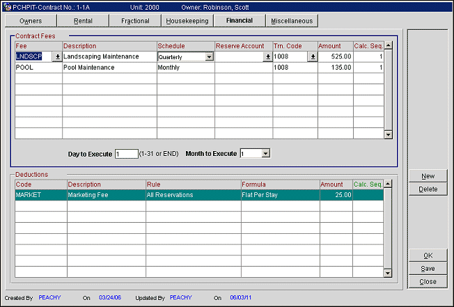 To define the fees and deductions associated with an owner contract, select Ownership>New Contract to create a new contract, or Ownership>Update Contract to update an existing contact.