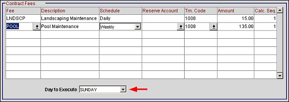 Depending on the value selected in the Schedule field, a user may specify the day of the week, date, and/or calendar month to post the fees. For example, if Weekly is selected in the Schedule field, the Day to Execute field appears. If the user selects Sunday, the fees will post once a week on Sunday's.