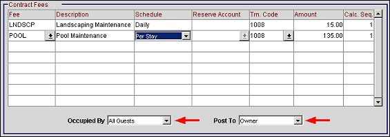 These fields allow a user to establish posting rules for a stay based on the type of occupant. Once the type of occupant is selected in the Occupied By field, select whether the fee will be charged to the reservation, the owner, or Fractional Owner in the Post To field.