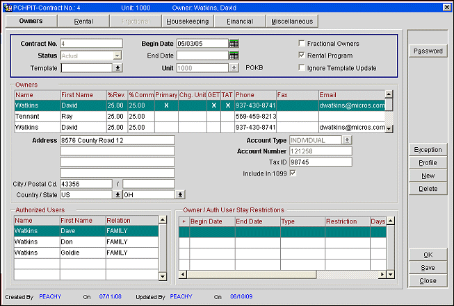 Authorized users are persons that have been granted permission from the owner(s) to use the unit. This grid is hidden when the Ownership>Fractional Ownership application function is set to Y and the Fractional Ownership check box is selected. The Authorized Users for Fractional Owned units is found within the Fractional Tab of the contract.