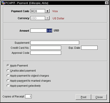 The following options are available for applying payments to an account. Provide the requested information and select the Post button to post the payment.