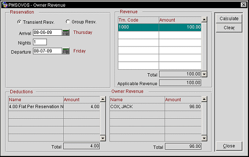 Transient Resv. Select the radio button to see the Owner Revenue calculation for a transient reservation selected for the specified dates.