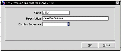 Display Sequence. Enter the sequence number in which the rotation override reasons code will be displayed in a list of values.