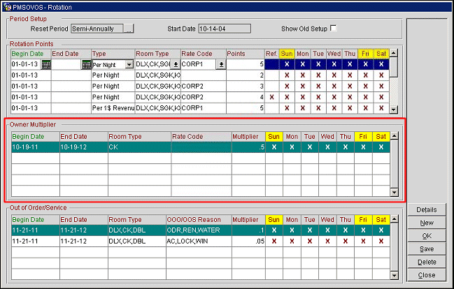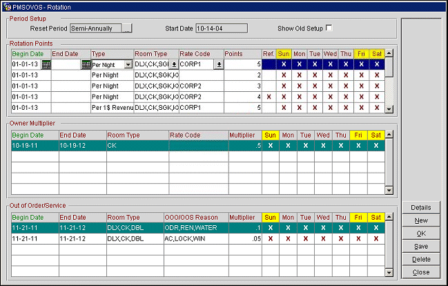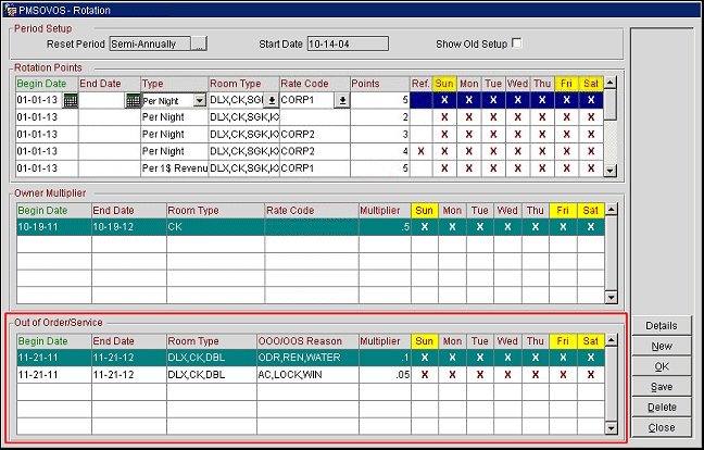 Available when the ROOMS MANAGEMENT > OUT OF ORDER and/or ROOMS MANAGEMENT > OUT OF SERVICE application functions are set to Y and the OWNERSHIP > OOO/OOS ROTATION POINTS application parameter is set to Y.
