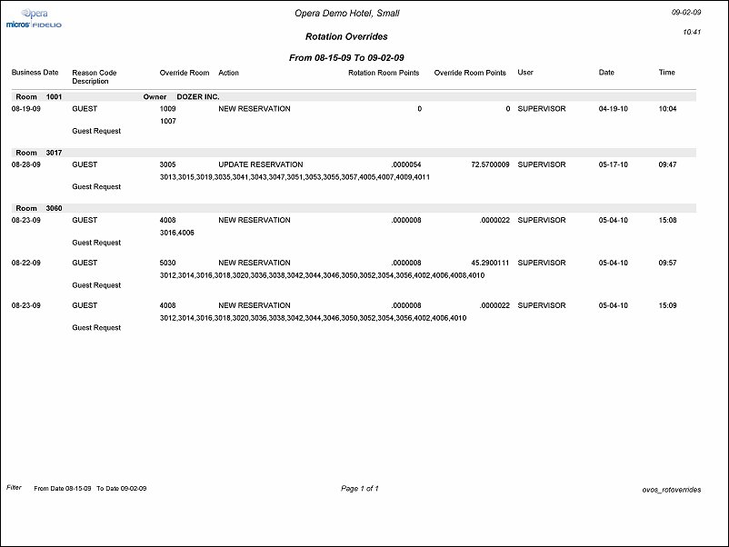 The OVOS Rotation Overrides report displays units participating in the room type rotation program that were reserved prior to being next in the rotation sequence (based on the rotation points formula. The report displays the reserved room, the room that was overridden, the business date of the override, the reason for the override, and the action taken (such as a new reservation or a room move). In addition, the report displays the number of rotation points earned for both the reserved room and the override room, the Opera user who made the change, and the date and time the change was made.