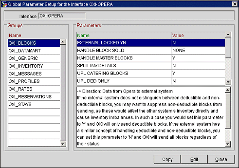 -> Direction: Data from OPERA to external system. If the external system does not have a concept of ‘open for pickup’ blocks, you may want to suppress non-open blocks from sending, as these would still allow pickup in the other system and cause inventory imbalances when a reservation is sent to non-open block in OPERA. In such a case you would set this parameter to Y and OXI_HUB will only send open for pickup blocks. If the external system has a similar concept of open for pickup blocks, you can set this parameter to N and OXI_HUB will send all blocks regardless of their status. An open for pickup block is defined by its status. Please check the OPERA block status configuration for further information. |