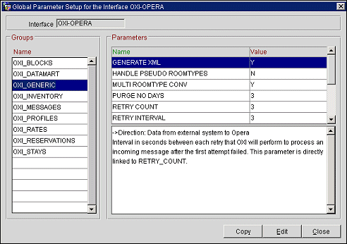 -> Direction: Data from external system to OPERA. OXI_HUB will retry this number of times to process an incoming message if the first attempt was not successful due to, for example, a locked record. A locked record can occur when OXI tries to process a message while another user is updating this record at the same time in ORS. OXI_HUB will retry the update x number of times as defined in this parameter. This parameter is directly linked to RETRY INTERVAL. |