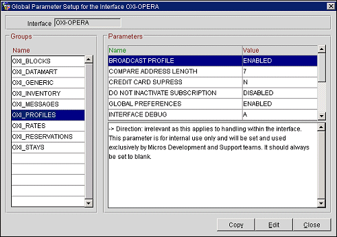 -> Direction: Data both ways between external system and OPERA This parameter is always set to OPERA_STAGE_MATCH for the interfaces OXI-OPERA, OXI-V6, OXI-V7, and OXI-CLS. In the future it will be possible to switch between OPERA_STAGE_MATCH and other options within this parameter. |