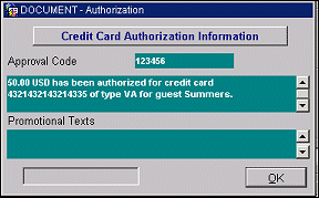 Note: If the guest makes a payment using a credit card, the Credit Card Authorization dialog box displays, showing you of the approval code, authorized amount, etc. See Payment by Credit Card, below, for details.