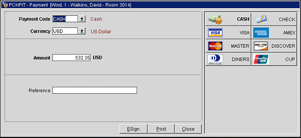 Payment Code. The payment method specified on the guest's reservation appears here by default. However, you may select a new payment method. Select the down arrow or press [F9] to choose another payment method from the list of values. Alternatively, you may type in the payment method description (or the first unique part of that description), or the payment method transaction code. The actual transaction code is displayed in the Payment Code field unless a Display Code has been configured, then it is displayed here (see Transaction Codes for details). An advantage of configuring Display Codes for transaction codes that are associated to a specific payment type, is that a payment method can be selected from the list of Payment Method buttons that are displayed on the right side of the Payment screen. These buttons will have logos on them (i.e., cash, check, credit card logos) once the transaction code has an associated credit card code defined and only specific major credit card logos (American Express, Visa, Master Card, JCB, Discover, Diners, UnionPay) are available.