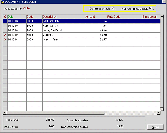 Commissionable. Total amount of commissionable revenue from this stay. The transactions that make up this amount are marked in the folio with an X along the left column of the display.
