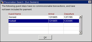 If no commission payments are associated with the selected reservation(s), you will receive a message indicating which of your selections will not be included for payment. Select the OK button to continue.