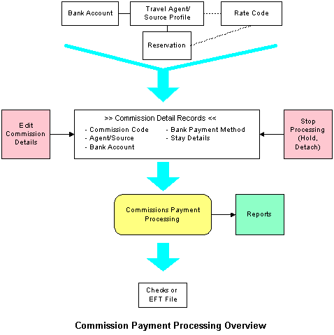 Commission payment processing is handled largely from the Commission Processing screen. Using this screen, travel agent and source details, bank account information, and guest reservations data are combined to determine the commission to be paid and the method of payment. As part of this process, commission details can be changed and new commission detail records can be added. You may also "stop processing" so that the commission on one or more commission detail records is not processed for payment by either placing the commission detail record on hold, or by detaching the commission record from the agent or source. Finally, the Commission Processing screen can be used to generate reports of commission payments and bank transfers, to prepare commission checks, and to create EFT files for payment processing by a clearinghouse (if the EFT add-on feature is used at your property).