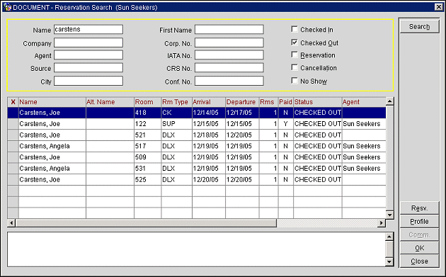 To view the guest profile associated with the reservation, highlight your choice and select the Profile button. To view complete reservation information, highlight your choice and select the Edit button. The Search button presents search criteria that let you to focus and re-start your reservation search.