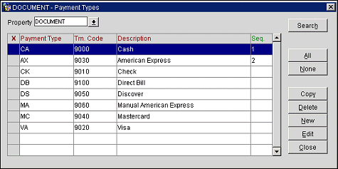 All/None. Use the All button to select all of the payment types displayed. Use the None button to de-select all of the payment types displayed.
