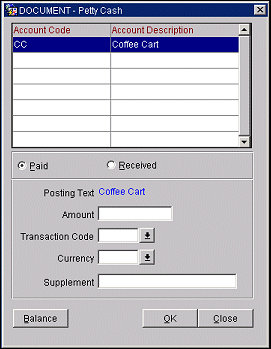 Transaction Code. Select the down arrow to choose the transaction code for this petty cash transaction. The transaction code(s) set up for cash payment transactions are listed on the LOV if the Paid radio button was selected. The transaction code(s) set up for cash receipts are listed on the LOV if the Received radio button was selected.