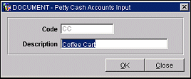 Code. Code to identify the petty cash account. This code may be changed once the account is set up.