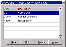 The Petty Cash Accounts setup screen shows the existing petty cash accounts. To create a new petty cash account, select the New button. To modify an existing account, highlight your choice and select the Edit button. The Petty Cash Accounts Input screen appears.