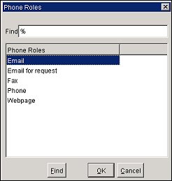 Each communication/phone type you create is associated with what is called a phone role. Phone roles indicate the method (category) of communication such as Phone, Fax, Email, Pager, and Web Page and are pre configured in Opera; provided as SID data.