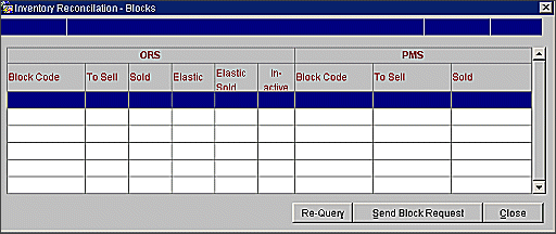 Blocks. Select this button to open the Inventory Reconciliation Allotment screen. This screen shows the detailed block sold rooms in ORS and PMS on the specified date. You can also have ORS send a block request to PMS.