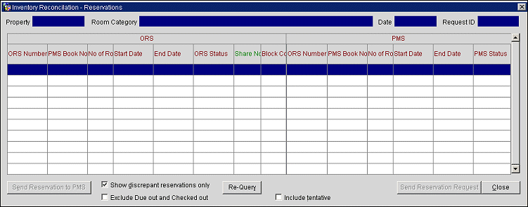 Reservations. Select this button to open the Inventory Reconciliation Reservations screen. This screen shows the detailed reservations for the sold rooms in ORS and PMS on the specified date. You can also have ORS send a reservation request to PMS.
