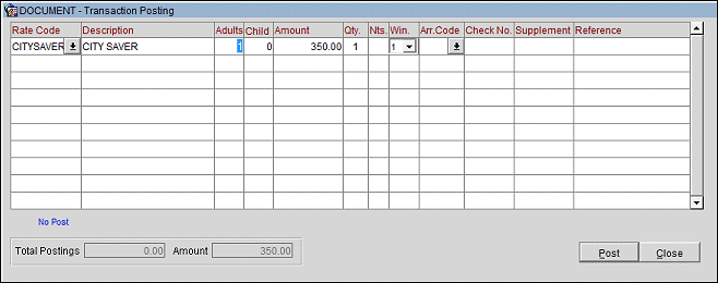 Amount and Total Postings. The Amount field in the lower screen shows the amount to be posted taking into account the rate code, room type attached to the reservation, number of persons, and quantity. In other words, if the 2- person rate for a DLX room is 375, and the quantity is 2, the Amount would be 750. The Total Postings field shows the sum of the amounts posted so far on this Transaction Posting screen.