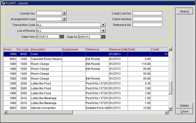 The Cashier Journal screen provides a fast way for you to find complete details on postings made at your property. The Journal includes a record of all postings made manually as well as postings made automatically (for example, postings made by the End of Day routine or by POS).