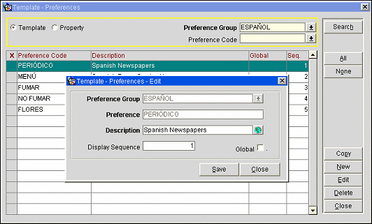 New preference codes may be created starting from the Preferences screen when the Template radio button is selected. Preferences may then be copied to properties where they may be edited for the property if necessary. Select the New button to create a new preference code. To edit an existing preference, highlight the preference and select the Edit button. The Preferences - New or Preferences - Edit screen appears, as appropriate.