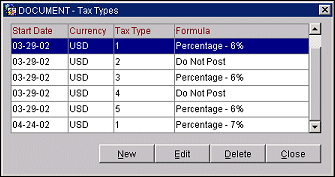 This screen allows you to create a new tax type, edit an existing tax type, or delete a tax type. The screen shows the following information for the tax types set up for the transaction code.